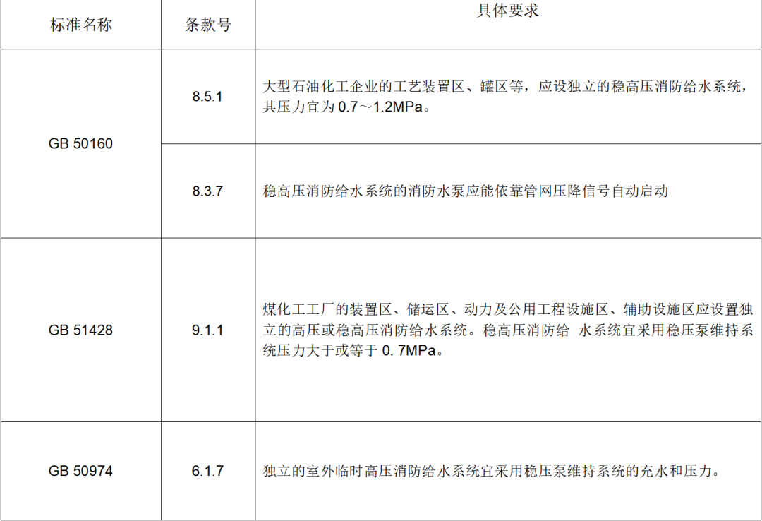 大型石油化工企业必须配备稳压泵,煤化工企业的装置区、储运区、动力及公用工程设施区、辅助设施区应设独立的高压或稳高压消防给水系统,精细化工企业没有明确要求。