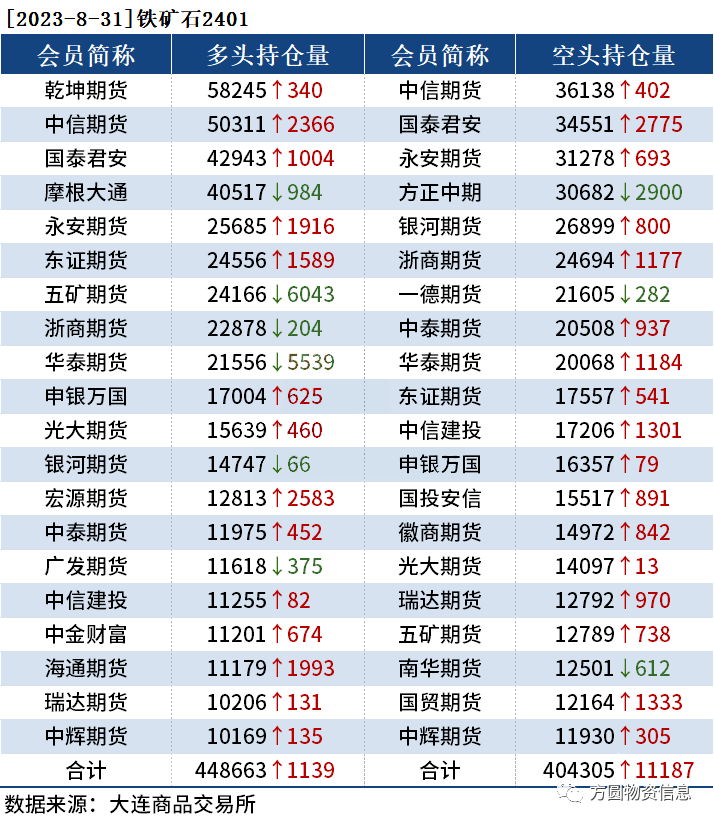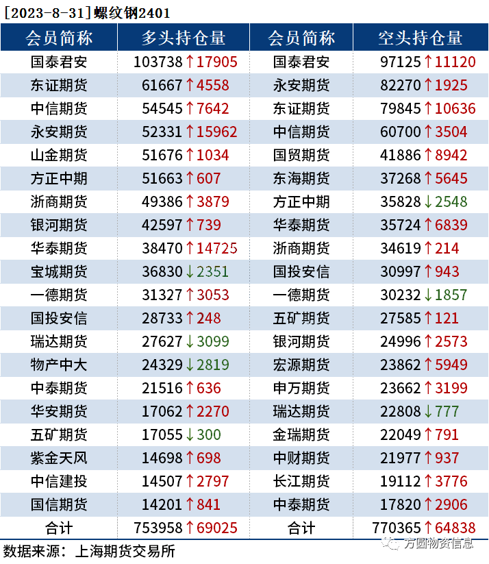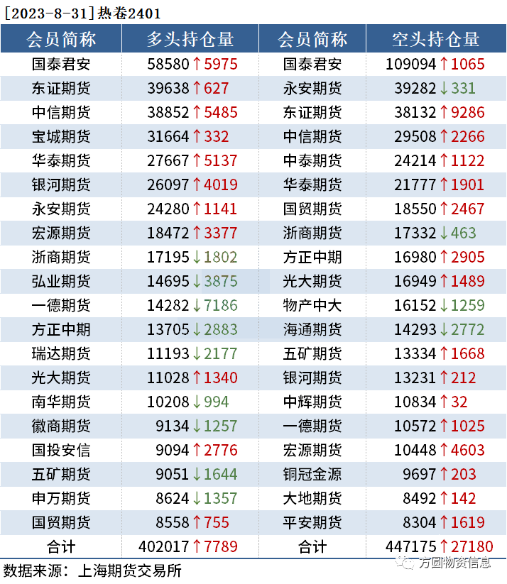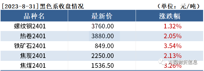 截至8月31日收盘,螺纹钢2401收3760元/吨,涨1.32%;热卷2401收3880元/吨,涨2.05%;铁矿石2401收849元/吨,涨3.54%。