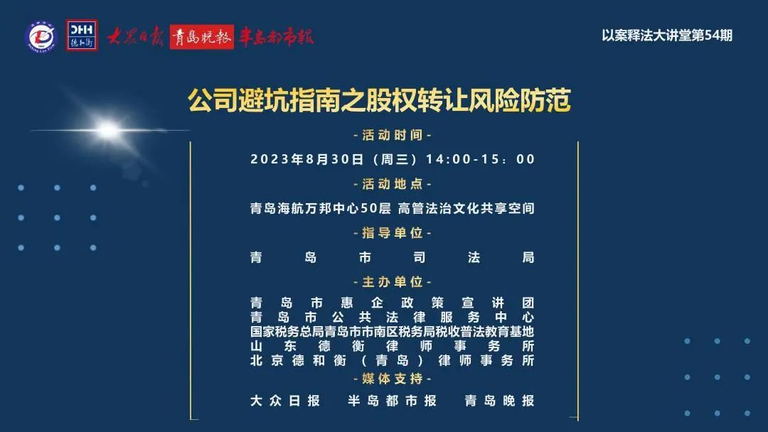 随着社会主义市场经济的发展以及营商环境的不断优化,股权交易日益频繁,并演化成一种集财产权流动、资本募集、资源优化配置等于一体的重要资本手段。因此,股权交易过程中相关风险的识别与防范,不仅决定了本次股权交易的成功与否,相关风险引发的纠纷很有可能会让参与方陷入诉讼的泥潭,面临无法估计的损失,甚至将导致其面临生存与发展危机。为预防此种情况,提前识别风险,由青岛市惠企政策宣讲团、青岛市公共法律服务中心、国家税务总局青岛市市南区税务局税收普法教育基地、山东德衡律师事务所、北京德和衡(青岛)律师事务所主办的“公司避坑指南之股权转让风险防范”为主题的第54期“以案释法大讲堂”于2023年8月30日成功举行。