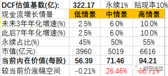 估值1:DCF绝对估值法,目前股价在低情景(未来10年增速预期2.5%)内在价值附近。
