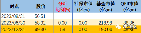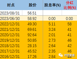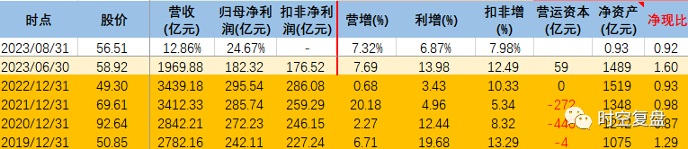 美的集团(000333),A股的家电龙头。8月31日收盘股价56.51元,市值3969亿元,PEttm12.48倍,当前归母净利润ttm为318亿元。从业绩增速看,美的集团近10年和近三年归母净利润CAGR分别为24.67%和6.87%,近3年业绩增速明显放缓,不过2023上半年净利润增速13.98%,又有所提速了。业绩整体还是很稳健,近10年都是正增长。股东回报方面,我们看到美的2022年明显加大了分红力度,分红比例达到58%,股息率七年来首次达到5%。