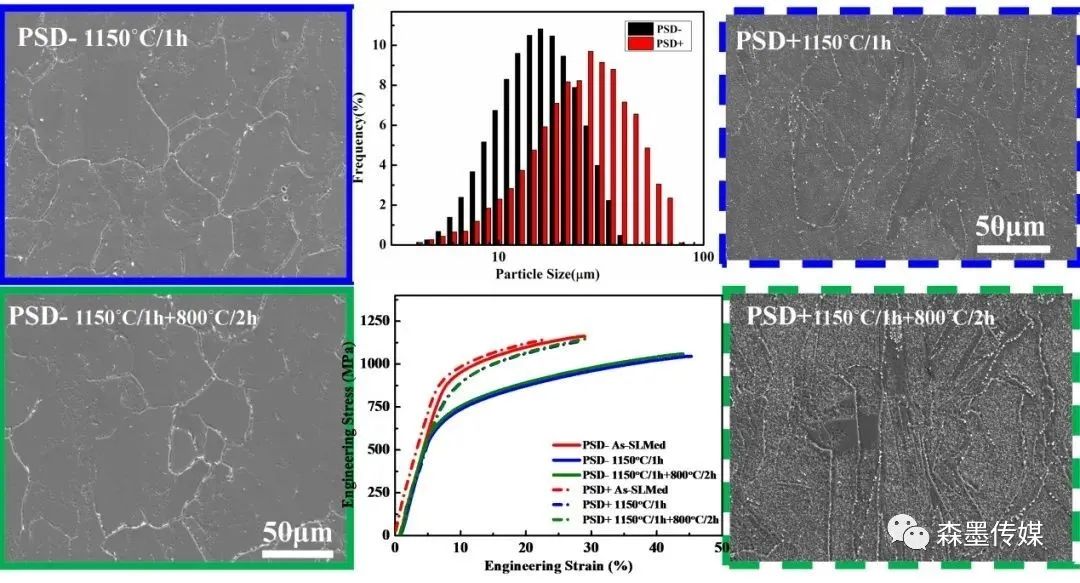 图1 两种尺寸分布,PSD- (10-30 μm)和PSD+(10-53 μm)粉末打印后热处理态组织图及其拉伸性能,PSD+粉末中析出相为Co3W2Si