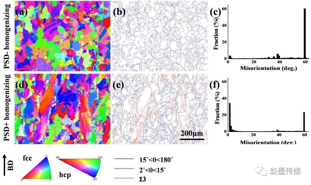 图2 两种尺寸分布粉末打印后热处理态晶粒形貌、晶界分布和Σ3孪晶界(60?)占比