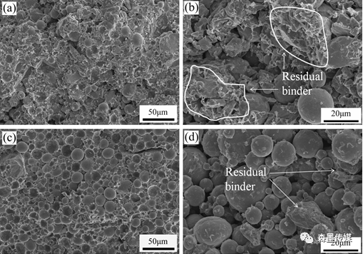 (a,c)氢化钛添加比例为60%(b,d)纯球形钛粉