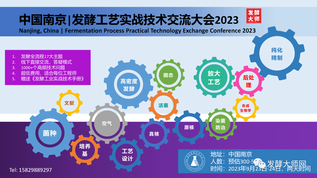 由发酵大师平台主办的发酵工艺实战技术分享大会(以下简称: DFTC2023线下实战),将于2023年9月23-24日在南京紫东大酒店举办,大会以专家答疑形式进行,17个主题、1000+个高频技术问题、技术展位与设备&原料展位混合,理论与实操结合,欢迎各路发酵企业&发酵工程师宁城相聚,共享纯技术分享之盛宴!