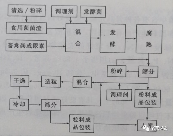 工厂化的食用菌菌渣有机肥生产工艺主要有以下流程。