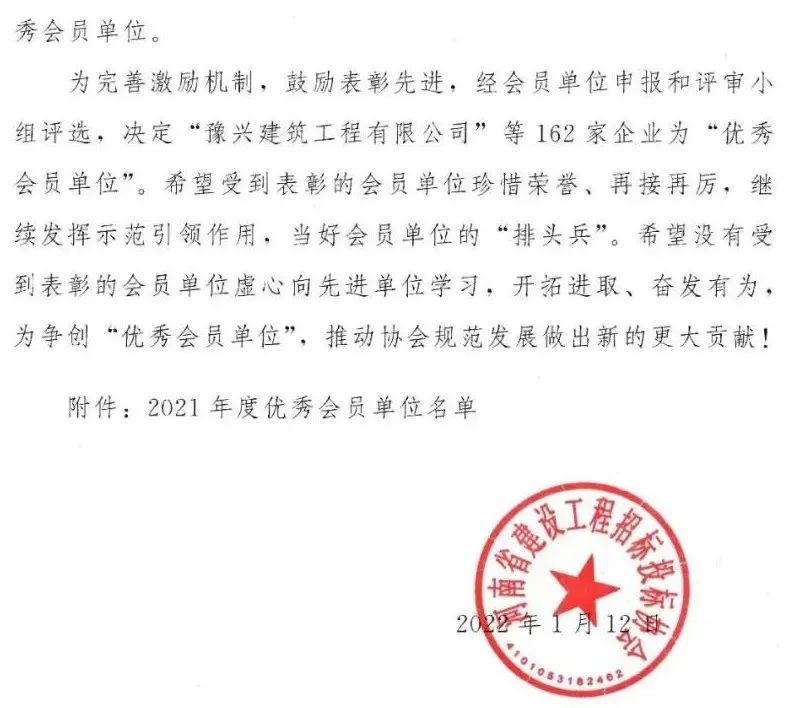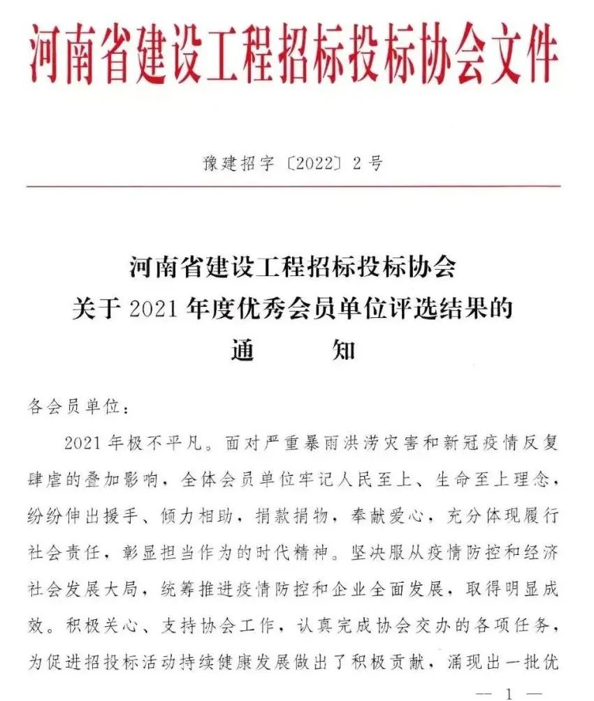 近日,河南省建设工程招标投标协会发布了《关于2021年度优秀会员单位评选结果的通知》,祝贺我公司被评为“河南省建设工程招标投标协会2021年度优秀会员单位”。