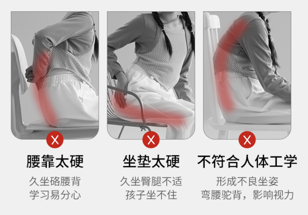 市面上的儿童椅,腰背太硬、坐垫太硬、不符合人体工学,长此以往就会导致脊椎变形,孩子形态不好。
