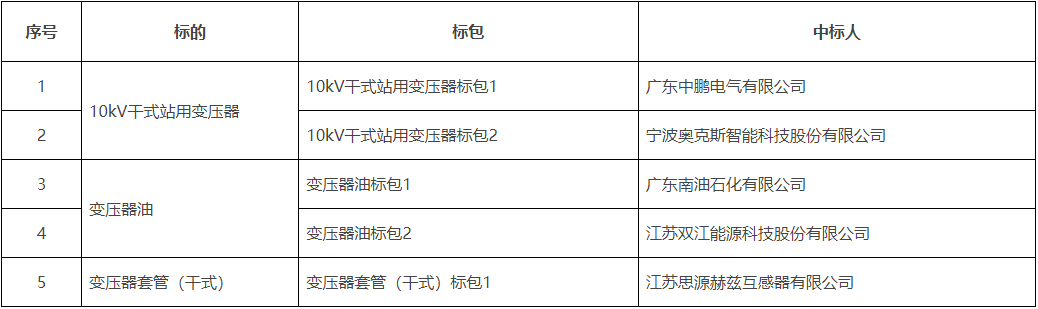 广东电网公司2023年第二批框架招标 (10kV干试站用变压器、变压器油、变压器套管) (招标编号:CG0300022001607358)中标结果,现予以公告: