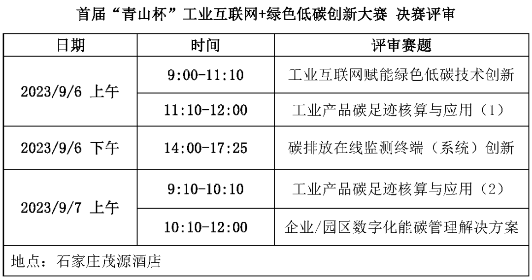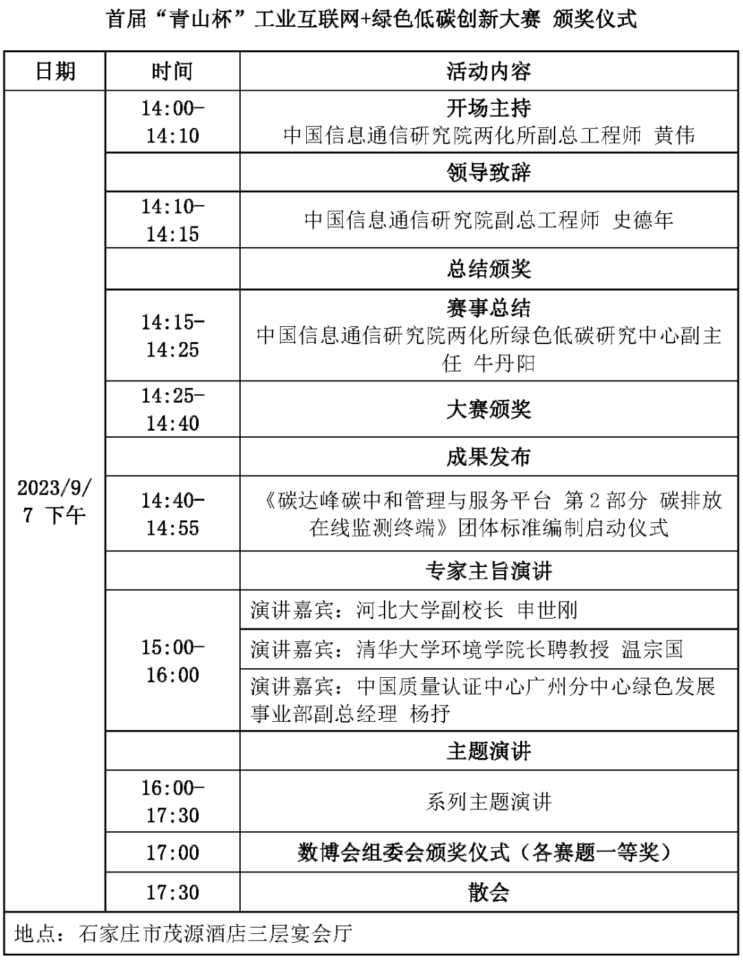 中国国际数字经济博览会是经党中央、国务院批准的,由工业和信息化部、国家发展和改革委员会、河北省人民政府共同主办的国家级博览会,2023中国国际数字经济博览会(以下简称“数博会”)定于2023年9月6-8日在河北正定召开。中国信息通信研究院在本次数博会期间组织举办首届“青山杯”工业互联网+绿色低碳创新大赛决赛。大赛旨在发掘遴选工业互联网赋能绿色低碳发展的新技术、新装备、新模式、新应用,探索数字化助力碳排放双控基础能力建设新路径,搭建全国性技术创新与产业互动平台,推动工业绿色化领域技术合作、项目孵化、产融对接,助力我国工业经济实现数字化绿色化转型升级。