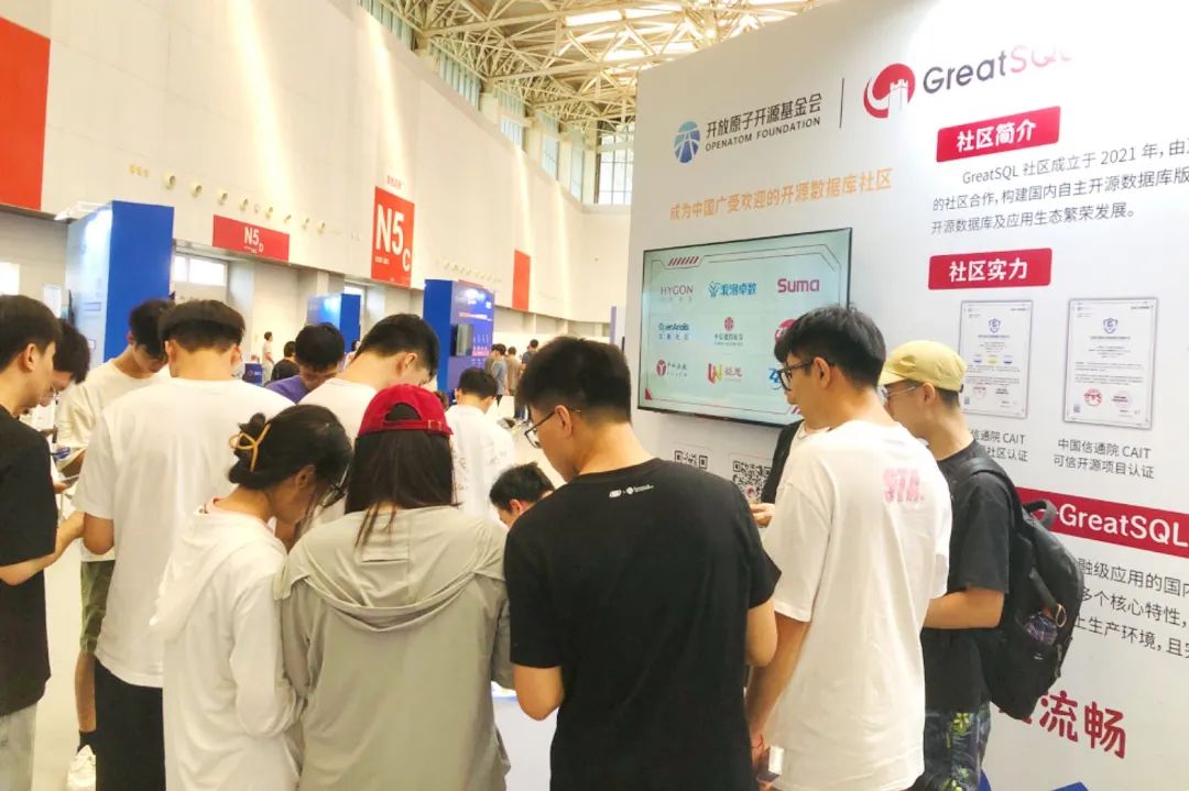 展位现场,众多开发者、DBA、用户前来咨询关于 GreatSQL 开源数据库的相关问题,参与社区互动活动,积极加入社区进行互动和贡献。