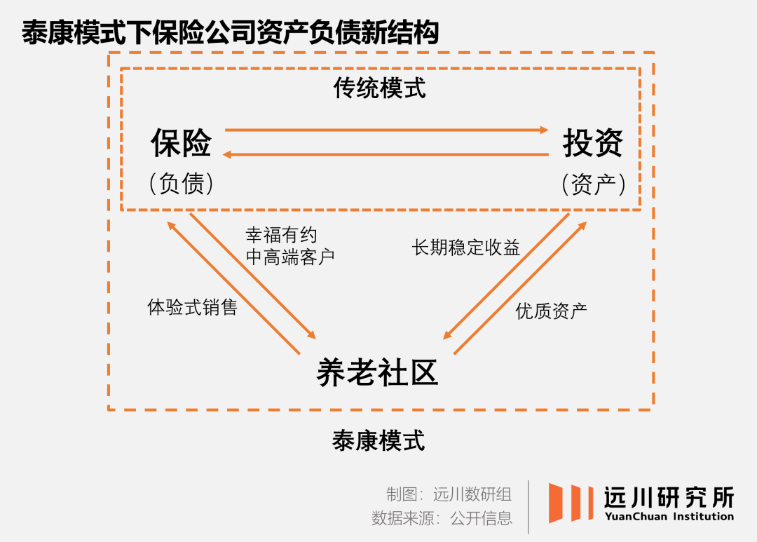 在这三重改变下,泰康模式颠覆了寿险行业的资产负债结构。传统模式下,寿险公司与客户的联系仅存在于“负债端”,自保险行业创立以来,公司和客户的关系皆是如此。