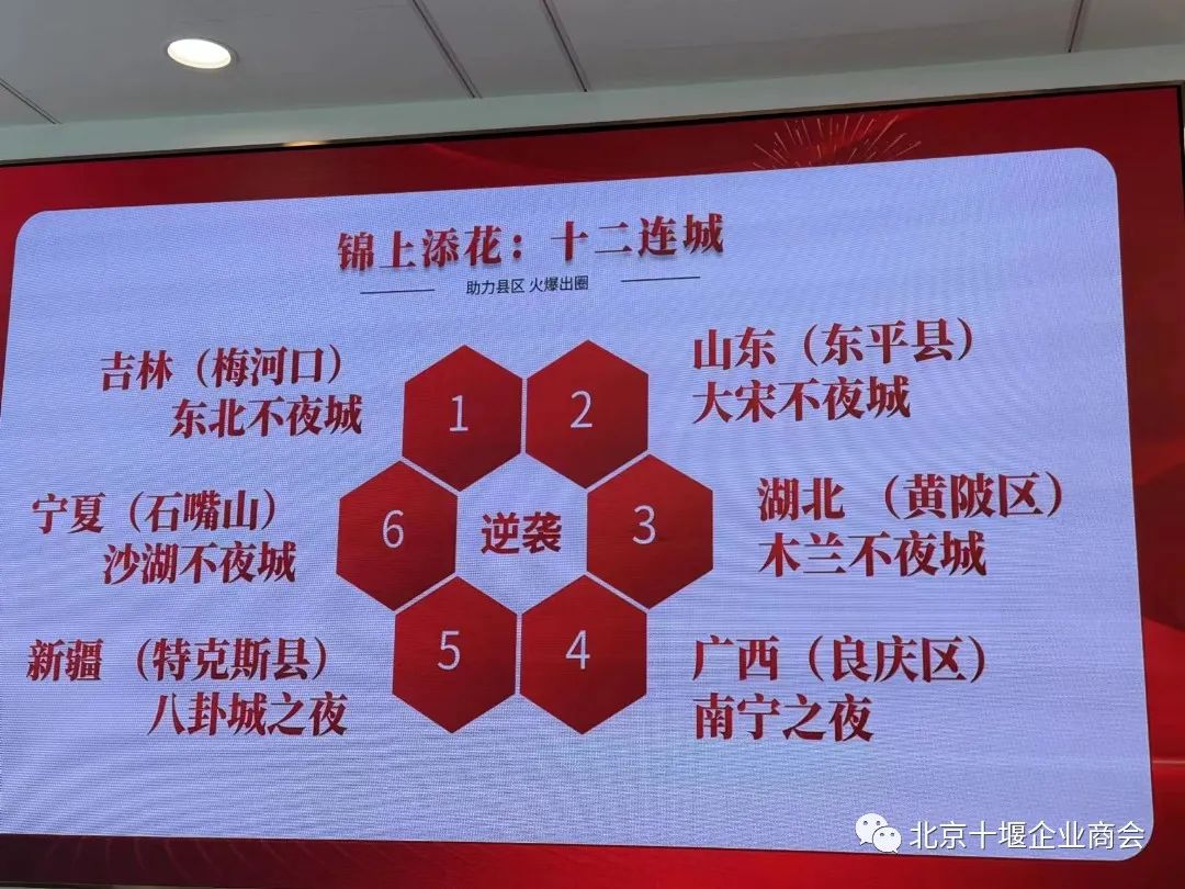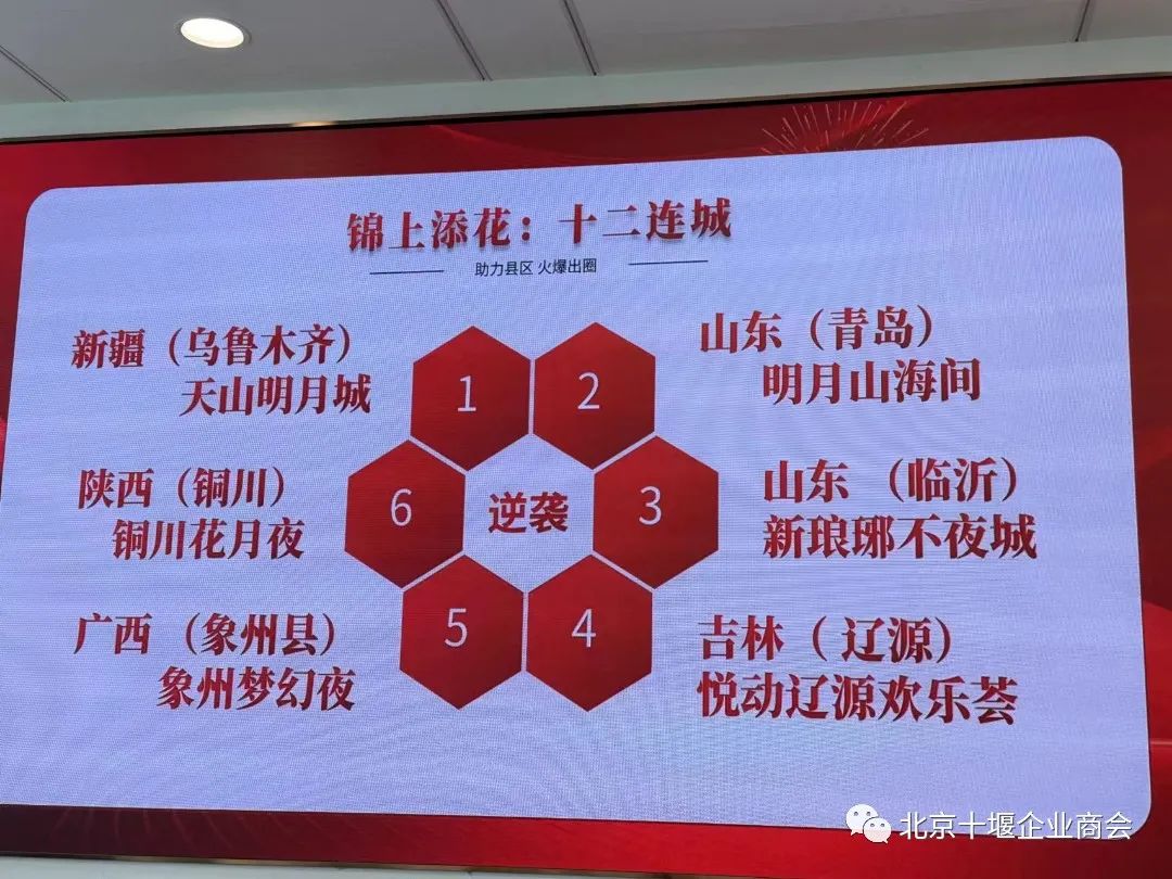 8月15日下午,北京十堰企业商会秘书处受邀与北京武汉企业商会,北京襄阳企业商会,北京宜昌企业商会,北京荆门企业商会,北京鄂州企业商会,北京恩施企业商会秘书处等,到北京襄阳企业商会会员单位、北京锦上添花文旅集团一同参加了交流座谈。该集团2020 年进入文旅夜经济行业,短短 3 年时间,已经打造出 12 个不夜城项目(累计 20 余个文旅街区),接待游客量已超过 1.8亿人次。