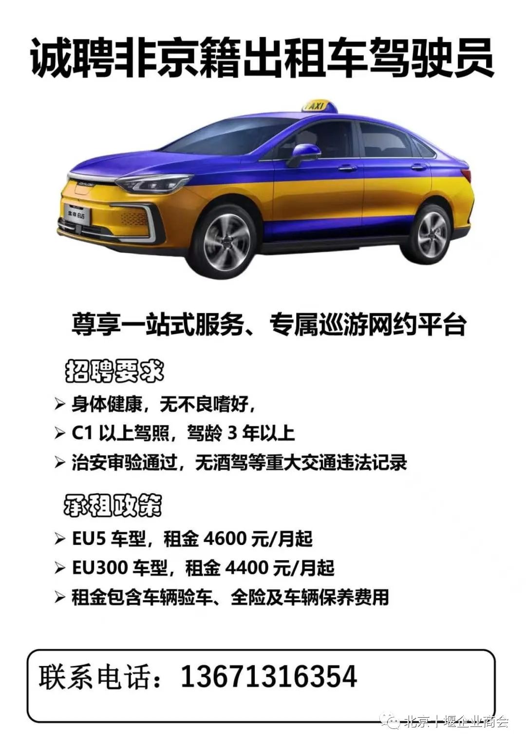 北京十堰企业商会会员单位:北京子驿科技有限公司现诚聘非京籍出租车驾驶员。