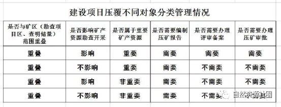 (依据:原国土资源部《关于规范建设项目压覆矿产资源审批工作的通知》(国土资发〔2000〕386号)“压覆矿产资源是指因建设项目实施后导致矿产资源不能开发利用”和《国土资源部关于进一步做好建设项目压覆重要矿产资源审批管理工作的通知》(国土资发〔2010〕137号)“建设项目与勘查区块范围或矿区范围重叠但不影响矿产资源正常勘查开采的,不做压覆处理”的规定)