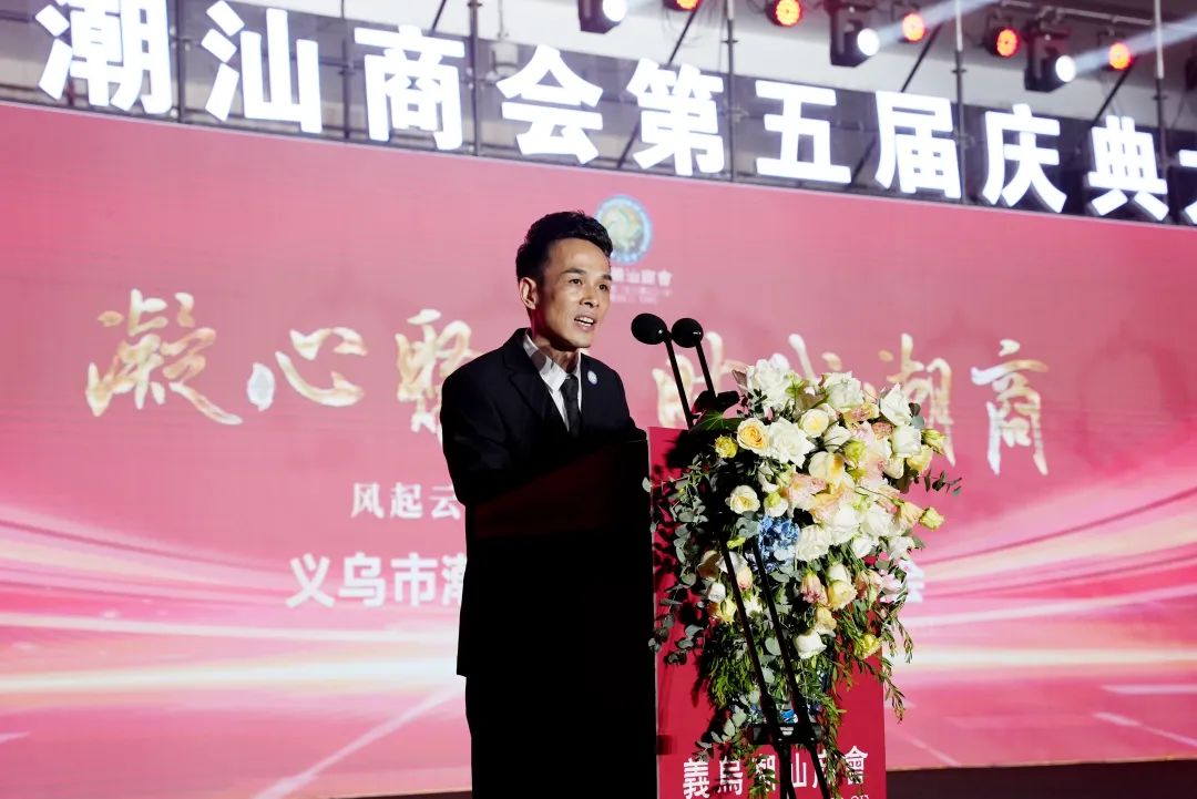 会长钟楚龙在致辞中回顾了商会成立以来所取得的成绩和存在的不足之处,表示今天不仅仅是庆典,更是商会砥砺前行、步向辉煌的新起点、新征程,时代在发展,潮商的精神在升华,在推进高质量经济发展的政策引领下,新一届商会领导班子将紧密团结全体会员,发挥全体会员的聪明才智,继承和弘扬潮商开拓创新、勇立潮头的红头船精神,践行“勤耕好学、刚正勇为、诚信包容”的义乌精神。风起云涌三江潮,激流奋楫新潮商,商会将致力于打造更加开放、创新、合作、共赢的平台,探索创新发展新路径,积极推动跨界合作与融合发展,在产业链上下游之间搭建桥梁,促进资源共享和互利共赢。作为时代潮商,需要紧跟时代发展的步伐,思维要不断创新,需要全体会员凝心聚力,携手并进,共创潮商新辉煌。