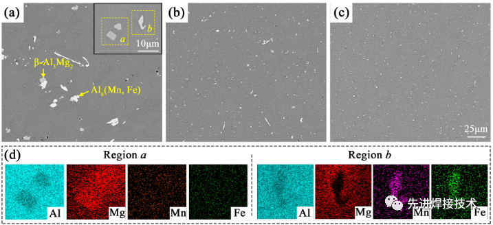 图5 微观结构SEM图像:(a)非RFP,(b)1.8 kN-RFP,(c)3.5 kN-RFP,以及(d)区域a和b的成分映射