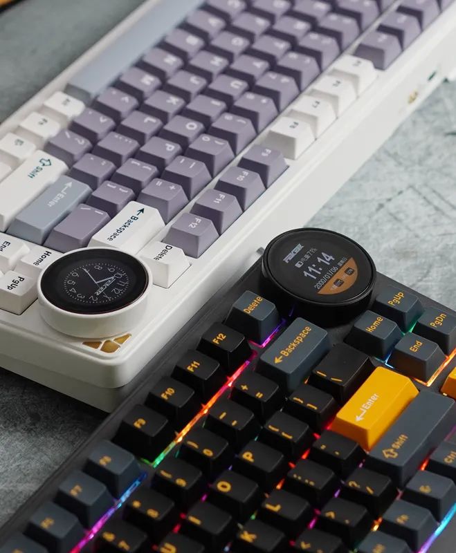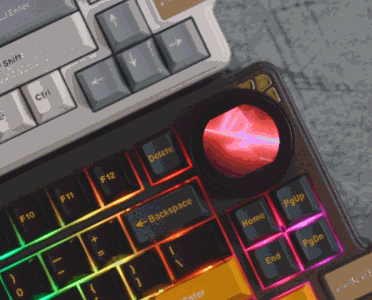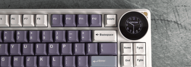 相比主流小旋钮小屏,(屏幕)观感和旋钮手感不要太爽,甚至颇为解压。默认显示状态,支持自定义(动图帧数会有限制),动图显示效果,还可以,这是传统小屏无法比拟的。通过屏幕,还可以切换不同设置状态(比如灯光模式、灯光亮度、连接模式、灯光颜色等),完全可视化。如果嫌选择菜单麻烦,它也还保留FN组合键操作。当进入休眠,屏幕依然常亮,显示动态时钟。手上样机,旋钮转动,会概率带动屏幕,出现轻微歪斜,据确认,大货已针对改好。