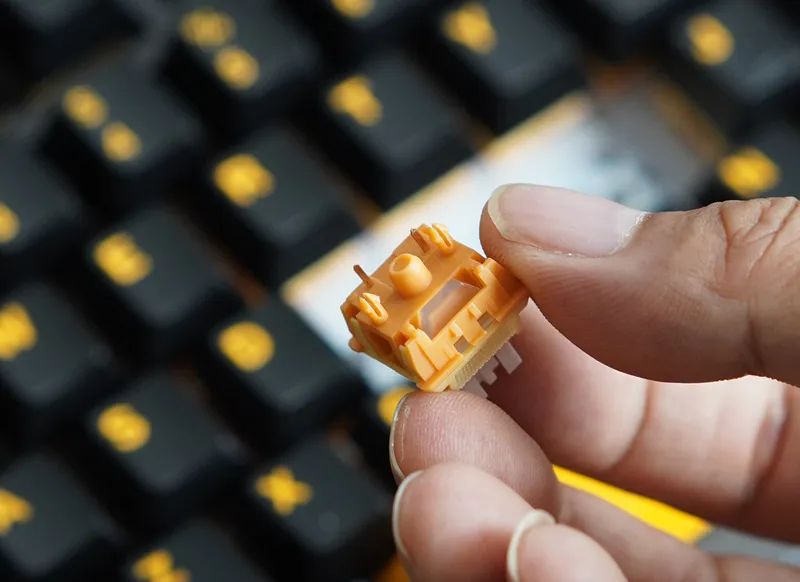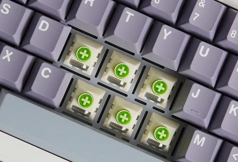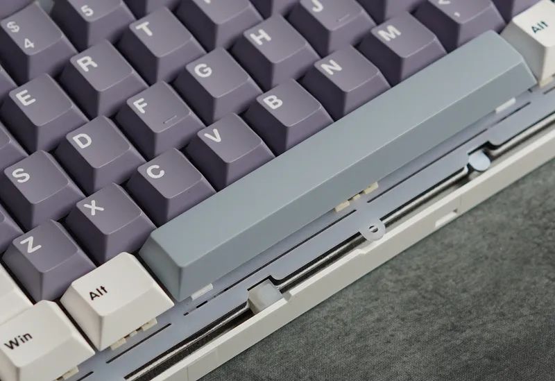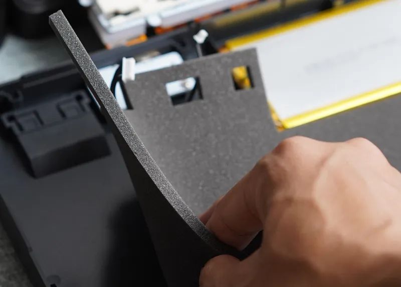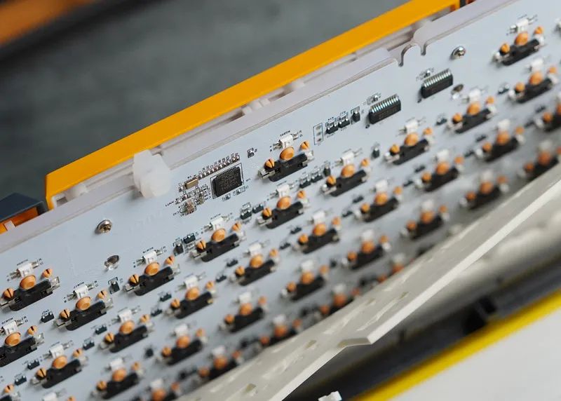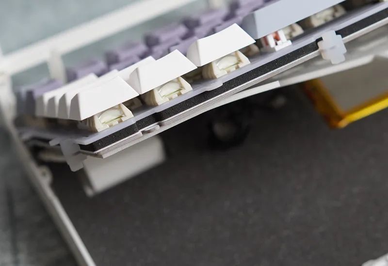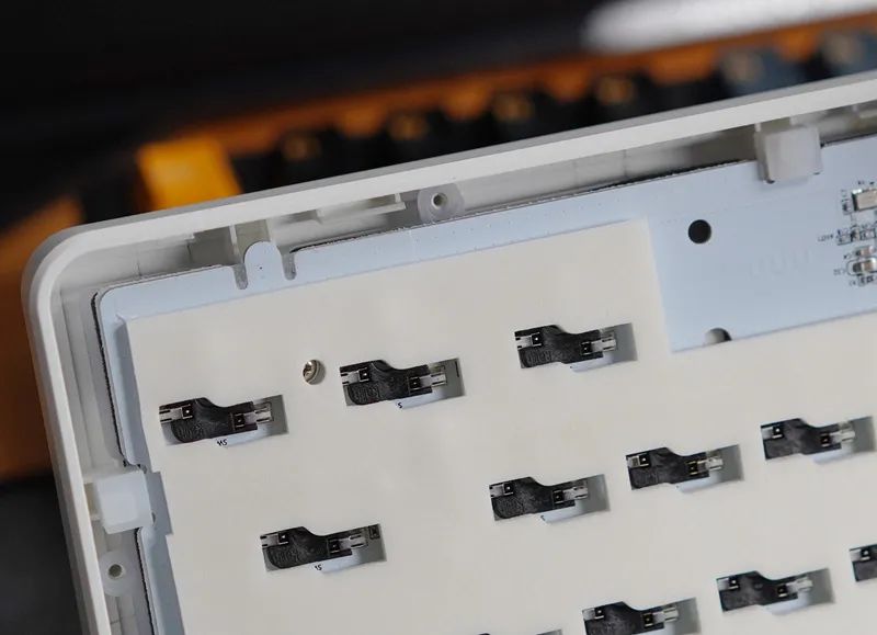 除此之外,结构也有亮点。除了常规有钢Gasket,还有一款无钢Gasket(垫片套在PCB,为后期切换结构做预留),且同样支持热插拔。不过得组合专用定制轴体,轴脚做了两个卡扣式固定机构。PCB表面,也还保留一层厚的硅胶,起到辅助固定作用。虽然但是,稳固度跟焊接或有钢是无法比的。会有松晃,导致按键触底,并不是很稳。无钢,也更软,这个版本,仅适合主力打字场景使用。既然“挖了个坑”,相信后续FEKER也会针对自家无钢热插拔,丰富一些可以兼容的定制轴。又或者,你可以单独整一块定位板,给装回,那便会回到传统有钢Gasket结构方案。这块硅胶,就成为了传统硅胶夹心。