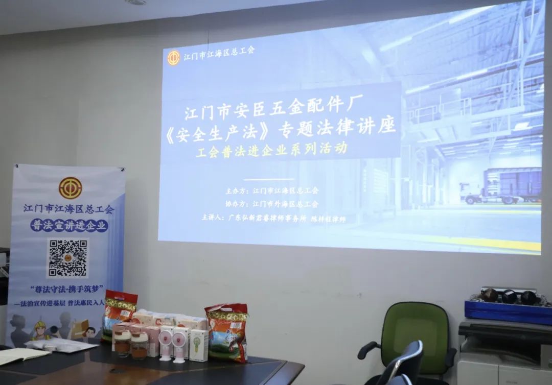 为深入贯彻习近平总书记关于安全工作的重要论述,进一步强化企业底线思维和红线意识,2023年8月30日,江海区总工会、外海街道总工会邀请广东弘新君睿律师事务所陈梓程律师为江门市安臣五金配件厂一众职工开展《安全生产法》专题法律讲座,助力把好安全生产关。