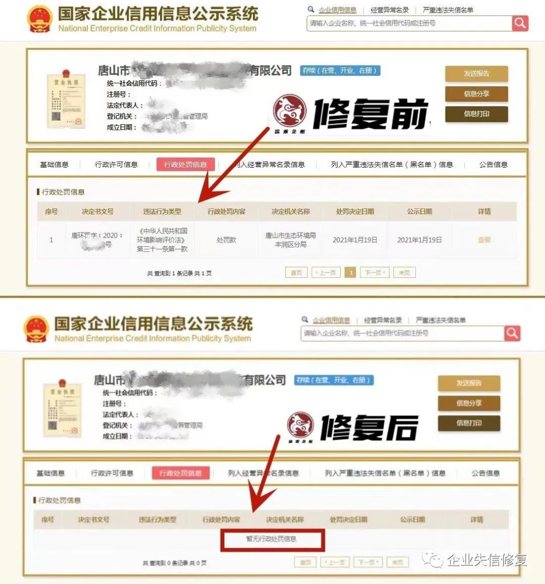 企业在受到上述情况的行政处罚后,所有的行政处罚记录都会在国家企业信息公示系统或信用中国等省级企业信用公示系统进行公示,并记录在企业信用信息中。当企业需要