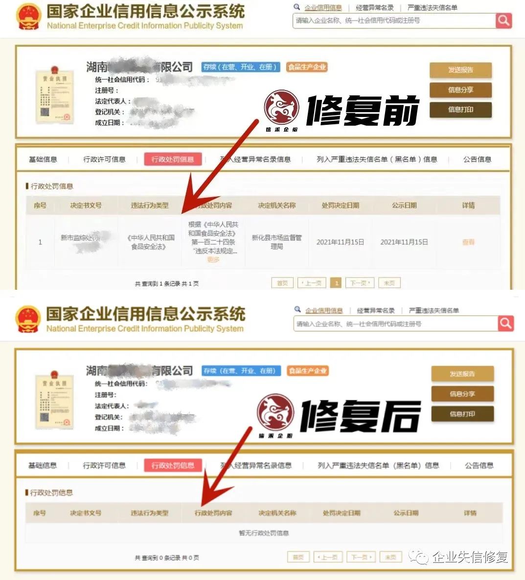 湖南某食品公司,违反食品安全法遭受处罚,现已修复完毕,恢复社会信用。