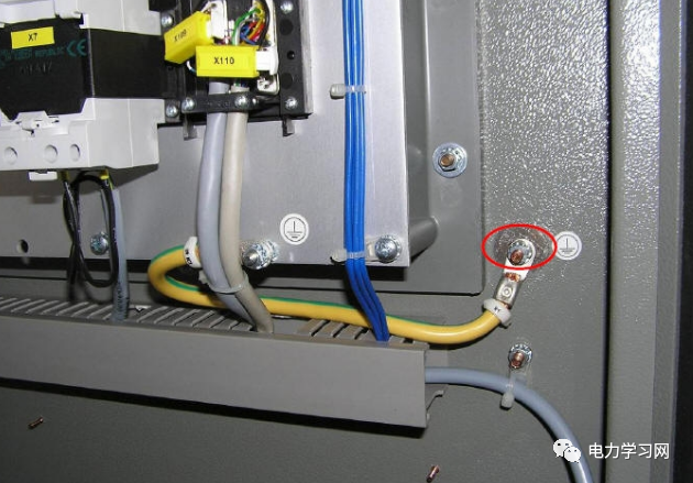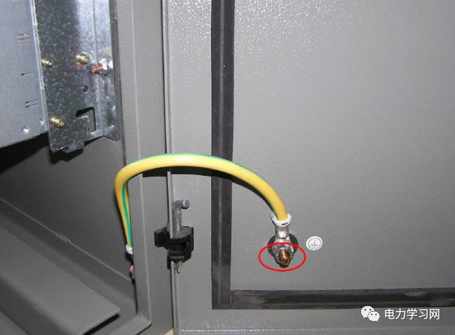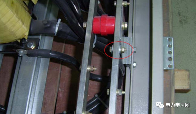 ?柜内任意两个金属部件通过螺钉连接时如有绝缘层均应采用相应规格的接地垫圈并注意将垫圈齿面接触零部件表面(红圈处),或者破坏绝缘层。