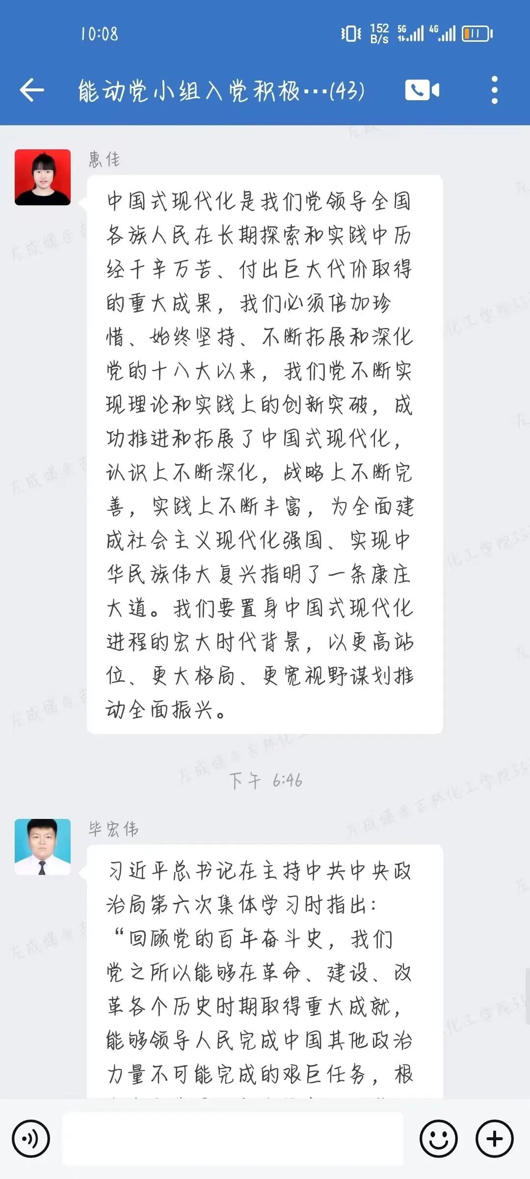 随后,组内各位学生党员围绕会议主题展开深入讨论。他们纷纷表示,在未来的学习和生活中坚持党的全面领导,不忘初心,砥砺前行,继续发挥党的优良传统,用自己青春的热血,为中华民族的伟大复兴贡献自己的力量。
