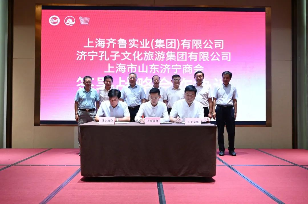 上海齐鲁实业(集团)有限公司总经理李文,济宁孔子文化旅游集团有限公司党委书记、董事长杨凤东,上海市山东济宁商会会长张玉杨在三方战略合作协议签字。王建章书记、吴兆路教授、丰家雷副书记、王智永董事长、张洪东书记、高洪彦会长、满其伟处长见证签约。