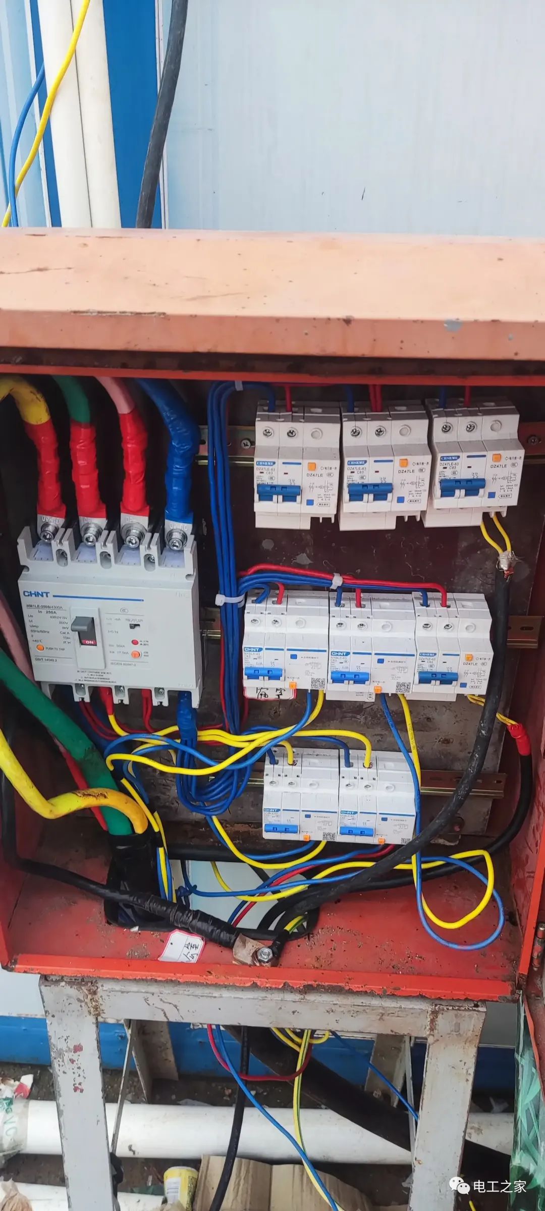 这是同行电工配的三级电箱,是宿舍用的,用电设备主要是空调1.5匹,电热水器3千瓦,蒸饭柜3千瓦,办公区电脑,打印机大慨3千瓦,