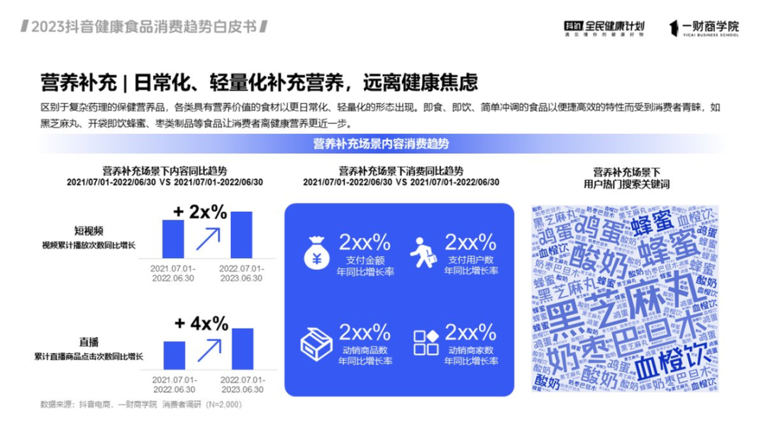 仅有一日三餐远远不够,据《白皮书》,超过90%的受访者认可三餐之外的营养补充。与营养场景有关的短视频累计播放次数和累计直播商品点击次数,同比分别增长超过20%和40%.消费端,支付金额、支付用户数、动销商品数和商家数,年同比增长率也超过了200%。