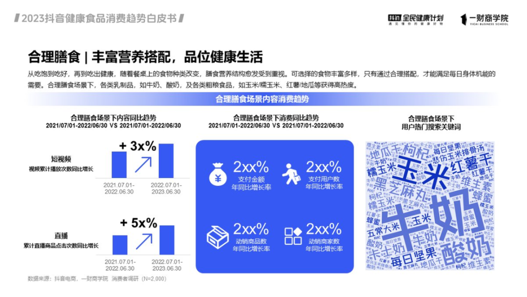 《白皮书》显示,合理的膳食营养结构,正愈发受到消费者重视。在2022年7月至2023年6月间,与合理膳食场景相关的短视频和直播内容,累计播放次数和直播商品点击次数,同比增长分别超过了30%和50%。消费端,合理膳食场景的支付金额、支付用户数、动销商品数和商家数,年同比增长率均超过200%。