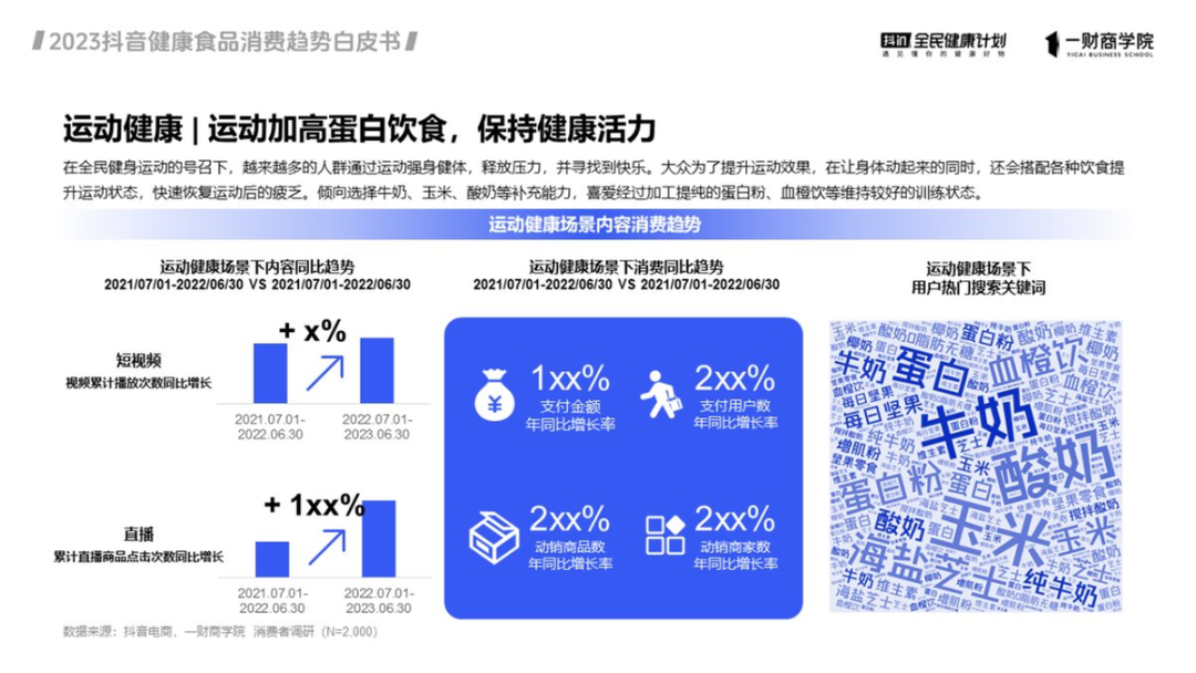 近年来,人们的健康意识不断提升,愿意主动探索、追求健康生活的方式。抖音相关场景下,短视频累计播放次数同比增长10%以上,累计直播商品点击次数更是同比增长100%+。健身渐渐成为很多人的选择,催生出更多搭配运动的营养产品需求。消费端,支付金额年同比增长率超过100%,支付用户数、动销商品数和商家数,年同比增长率则超过200%。