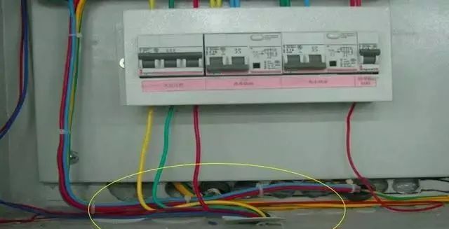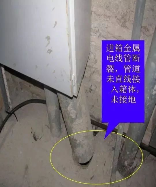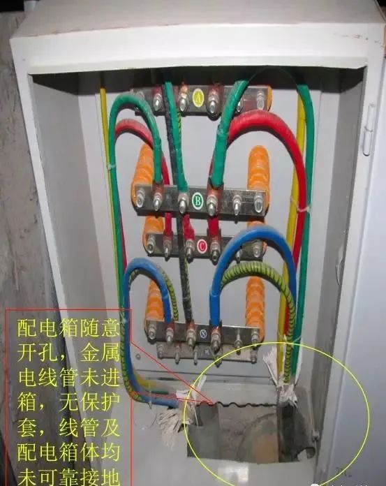 配电箱背后开孔进线,不符合规范要求且对日后维护管理带来较大不利,此类施工应禁止。