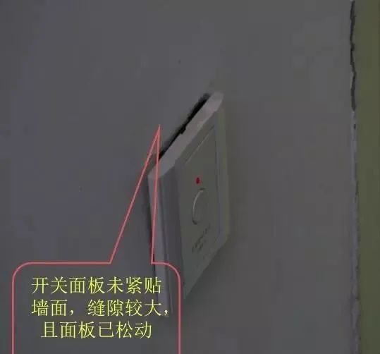 3)暗装的开关面板应紧贴墙面,四周无缝隙,安装牢固,表面光滑整洁、无碎裂、划伤,装饰帽齐全。