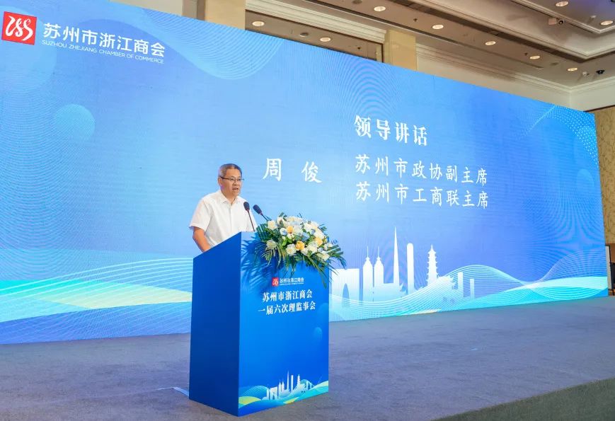 苏州市政协副主席、市工商联主席周俊出席大会并作讲话,苏州市民政局社会组织管理处处长高云,苏州市工商联经济联络处副处长许剑出席大会。