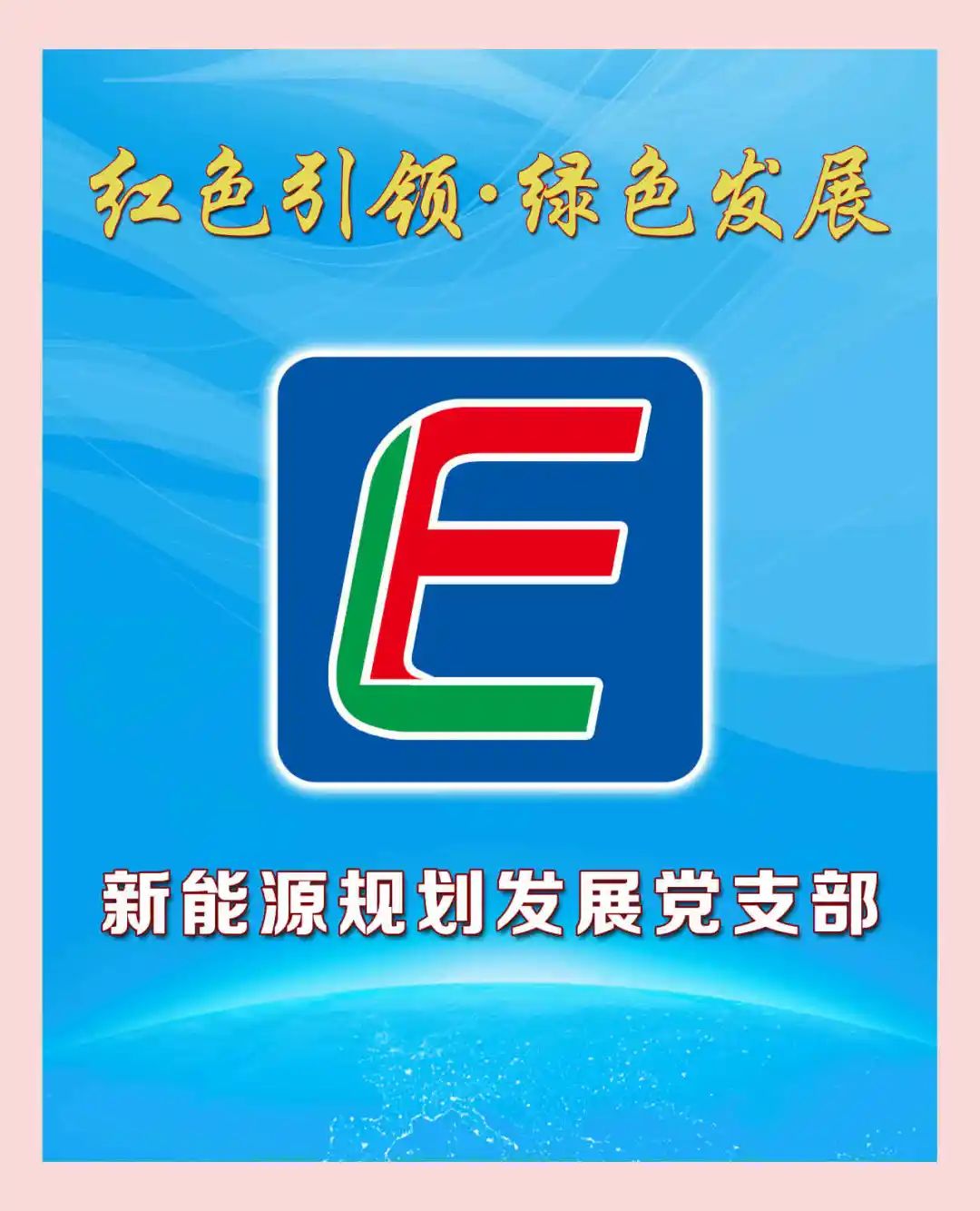 新能源规划发展党支部品牌为“红色引领·绿色发展”,标识以字母L、F、E为基本要素,L是绿色拼音首字母,F是发展拼音首字母,两个字母合起来形成字母E,即Energy的首个字母,代表能源、电力,标识简单直观,意为新能源规划发展党支部在企业结构调整、绿色转型发展中始终坚持党建引领,勇挑重任、冲锋在前,汇聚红色动力,赋能绿色发展。