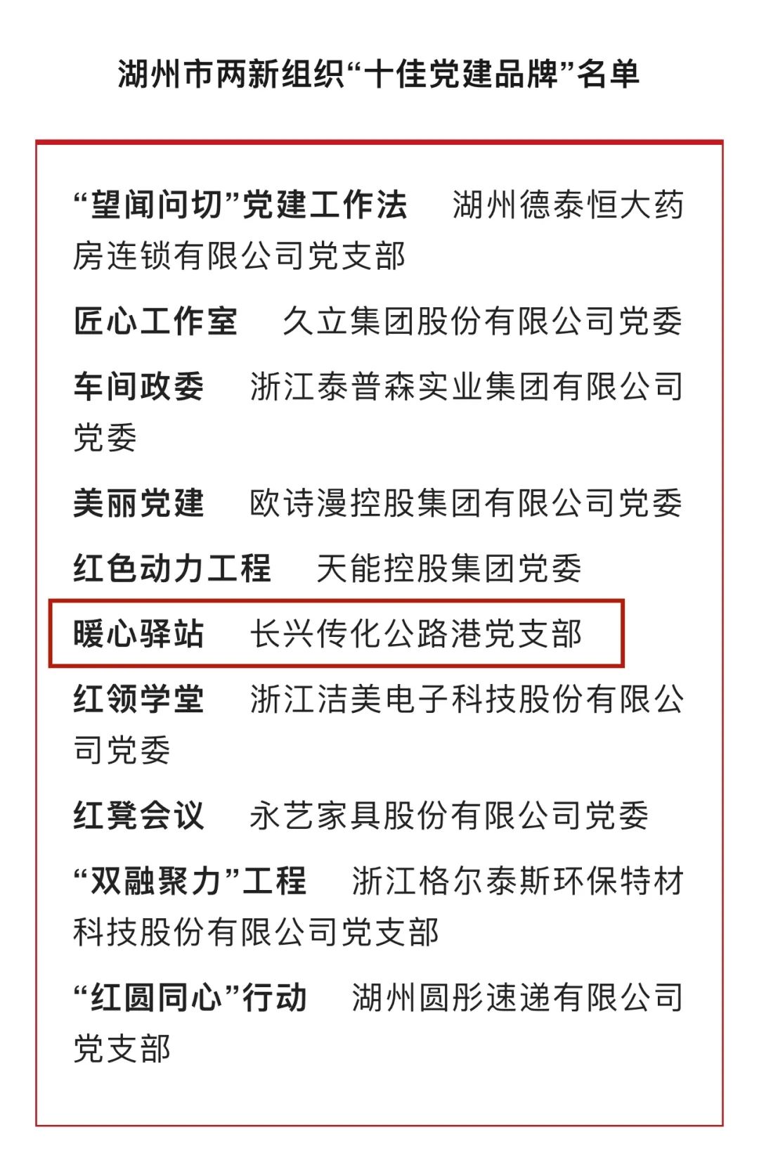 日前,长兴传化公路港党支部“暖心驿站”党建品牌被市委组织部、市委两新工委授予湖州市两新组织“十佳党建品牌”称号。