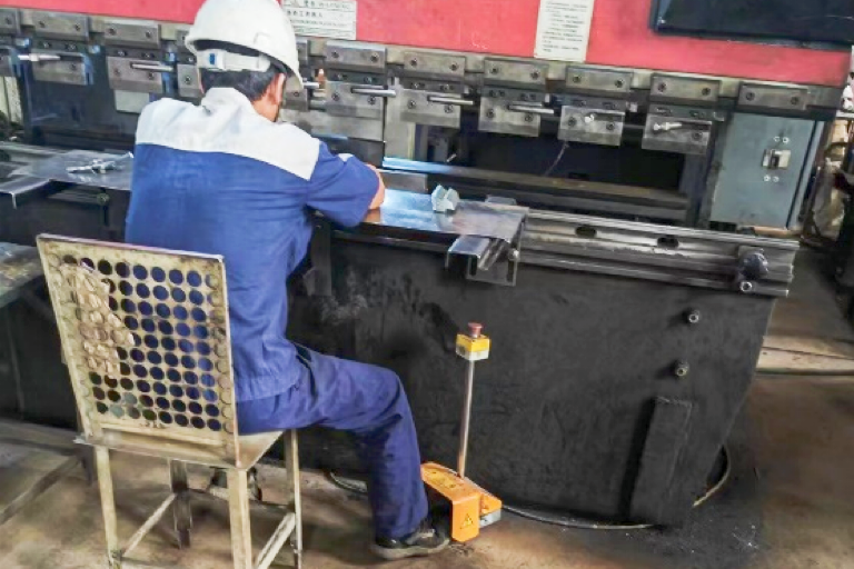 执法人员对常熟市通达钣金有限责任公司开展执法检查时,发现车间内有一台折弯机使用脚踏开关,未安装光栅等安全防护装置。