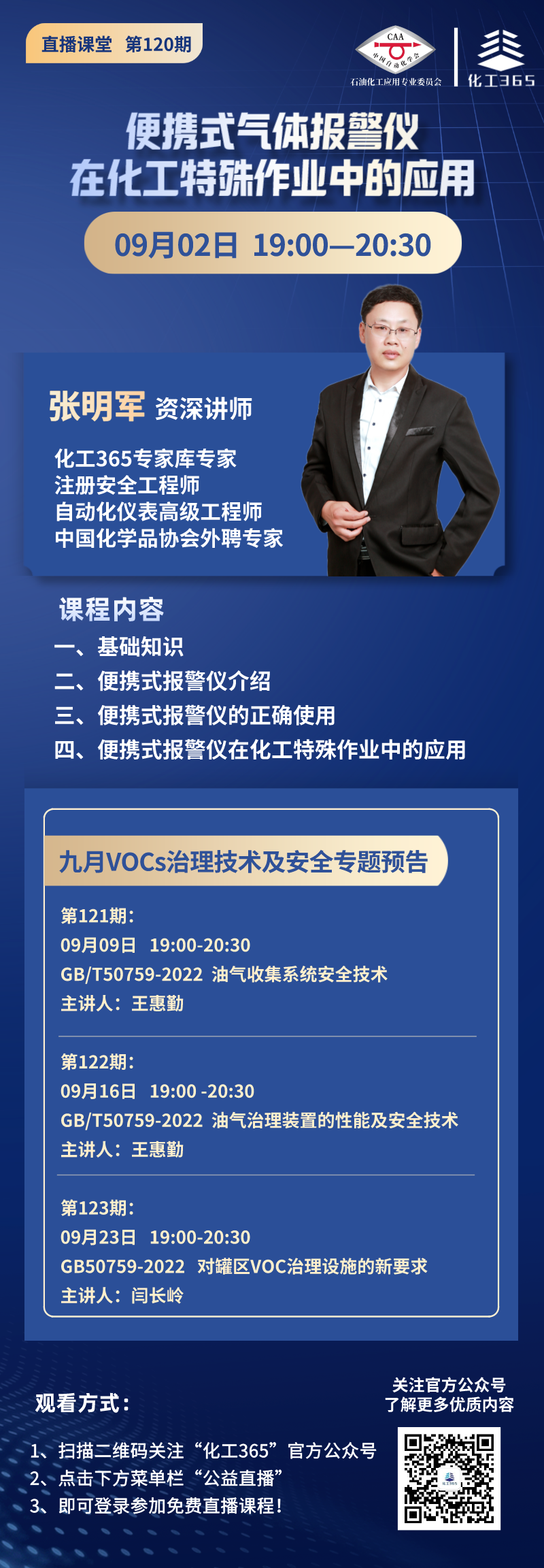 化工365直播大讲堂联合中国自动化学会石油化工应用专委会、北京中智伟业技术培训中心特邀专家张明军老师为大家以“便携式气体报警仪在化工特殊作业中的应用”为题展开线上讲座。希望本次课程可以提高员工的安全意识,避免因疏忽而导致的安全事故,进而保障员工的安全和环境保护。