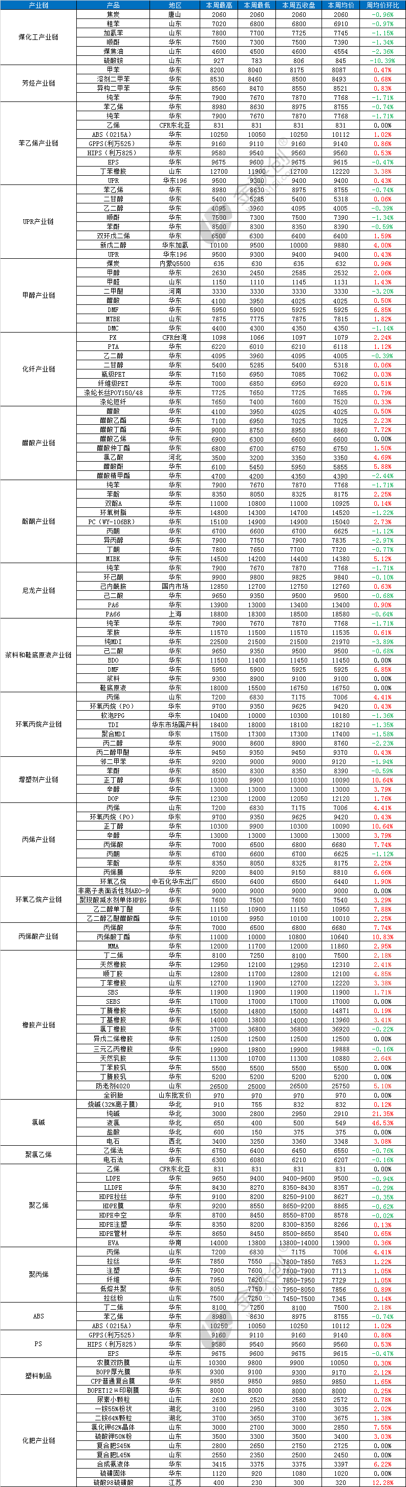 80个上涨品种中,涨幅最大3个品种分别是液氯(46.53%)、纯碱(21.35%)、硫酸98硫磺酸(12.28%);36个下跌的品种中,跌幅最大3个品种,分别是硫酸铵(-10.39%)、纯MDI(-3.89%)、二甲醚(-3.20%)。