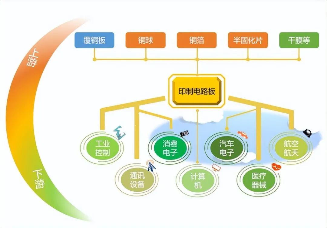 印制电路板的原材料主要包括覆铜板、铜球、铜箔、半固化片、干膜及其他化工材料。下游行业主要包括工业控制、通讯设备、消费电子、计算机、汽车电子、医疗器械、航空航天等。印制电路板行业上下游联系紧密,上下游的关系如下图所示:
