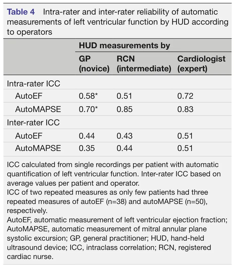 表4:由HUD根据操作人员自动测量左心室功能的评分者内和评分者间的可靠性