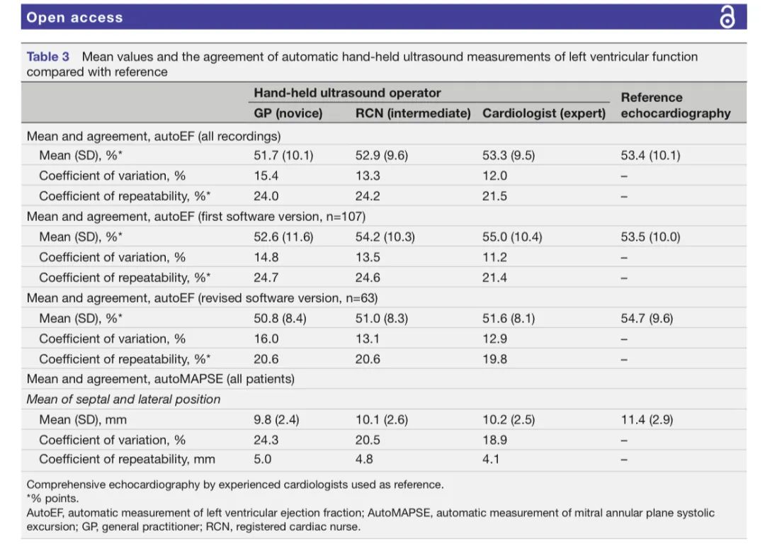 表3:自动手持超声测量左心室功能的平均值和与参考值的一致性