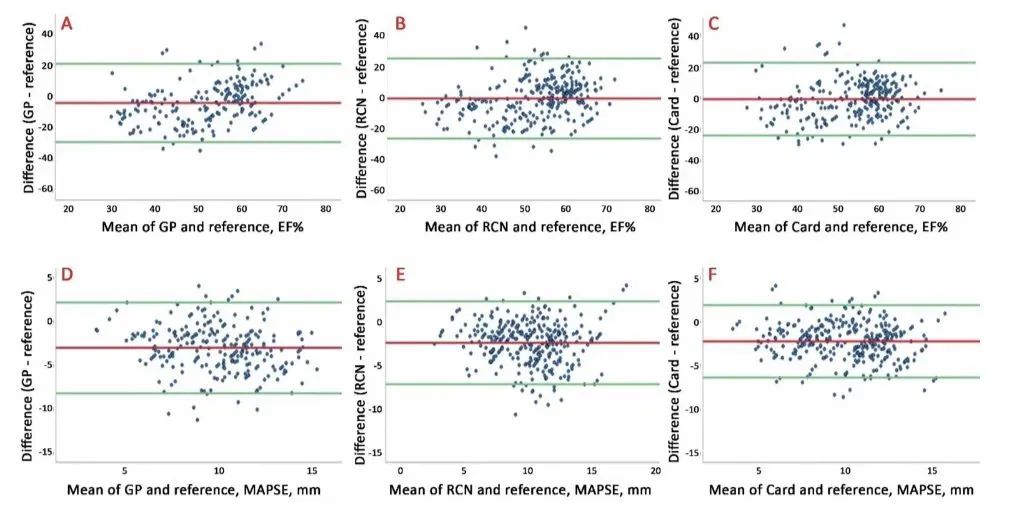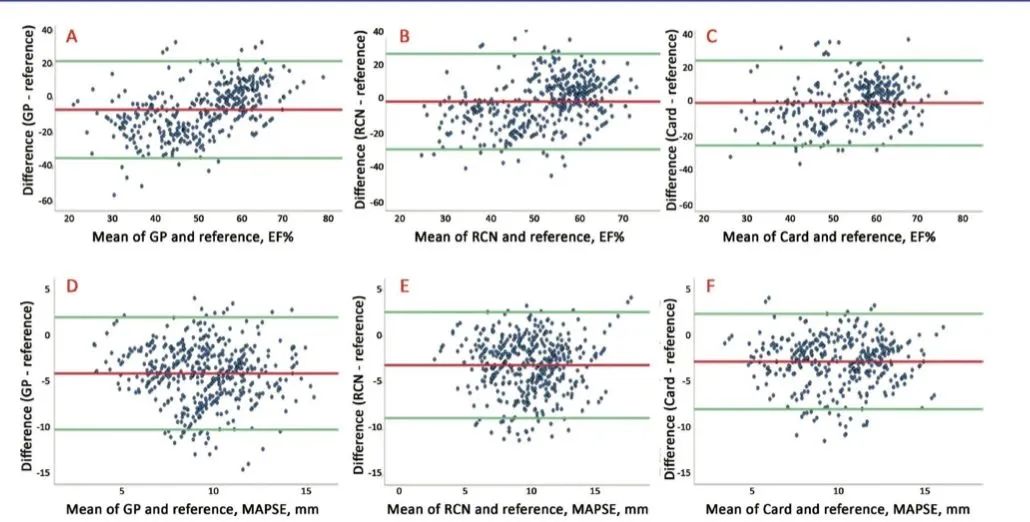 图2:Bland-Altman图说明了全科医生所有autoEF和autoMAPSE记录之间的一致性,与参考超声心动图相比,中级组和专家组使用自动决策支持软件对所有记录进行了比较,而不考虑图像评分。