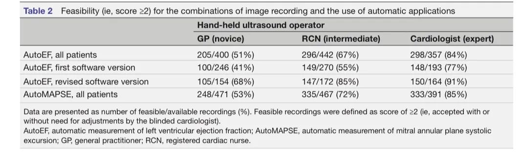 研究人群代表在日常临床实践中为诊断或排除心衰而进行心脏超声检查的患者。新手组接受了有限的集中训练。中级组在日常临床上有使用有限心脏超声的经验,专家组具有常规心超的全面检查的经验。患者多为超重或肥胖,并发房颤、高血压等。因此,成像不佳和房颤(24%的检查中存在)都可能干扰图像采集和自动测量的精度。