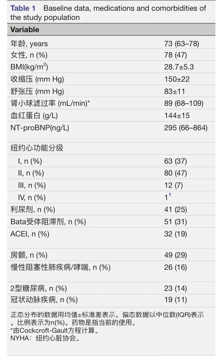 当天抽取血液样本,并在院内认可的实验室进行分析。检测血清 n末端脑钠肽前体(NT-pro-BNP)、血肌酐、估算的肾小球滤过率 (Cockcroft-Gault公式计算 )、电解质(钠、钾)和血红蛋白 (g/L) 。由护士进行纽约心脏协会(NYHA)心功能分级,测量体重 (kg) 、身高 (cm)和血压 (mm Hg)。人体测量值四舍五入到最接近1的倍数。