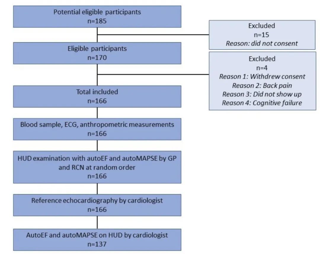 图1显示研究参与者的流程由5名全科医生中的1名和3名注册护士中的1名按随机顺序对患者进行检查,专家组一名专家进行HUD检查,另一名专家进行常规心超检查,他们对彼此的结果均不知情。由于某些原因,前29例患者未由专家组进行HUD检查。本研究未对参与者进行额外的随访或超声检查。