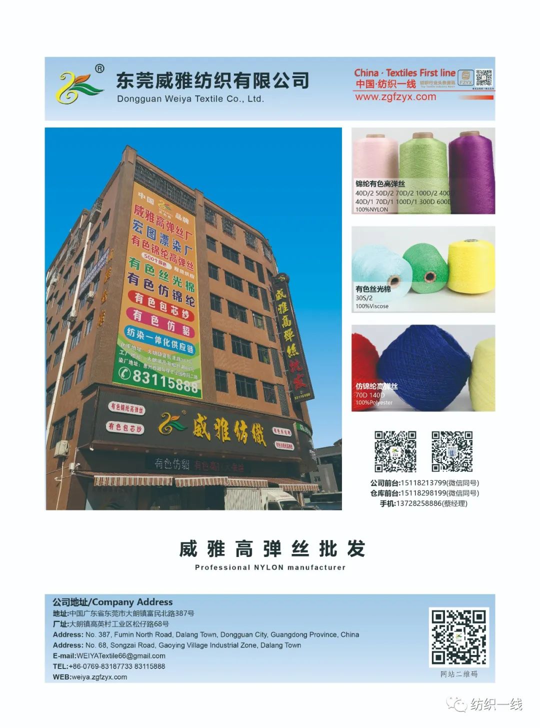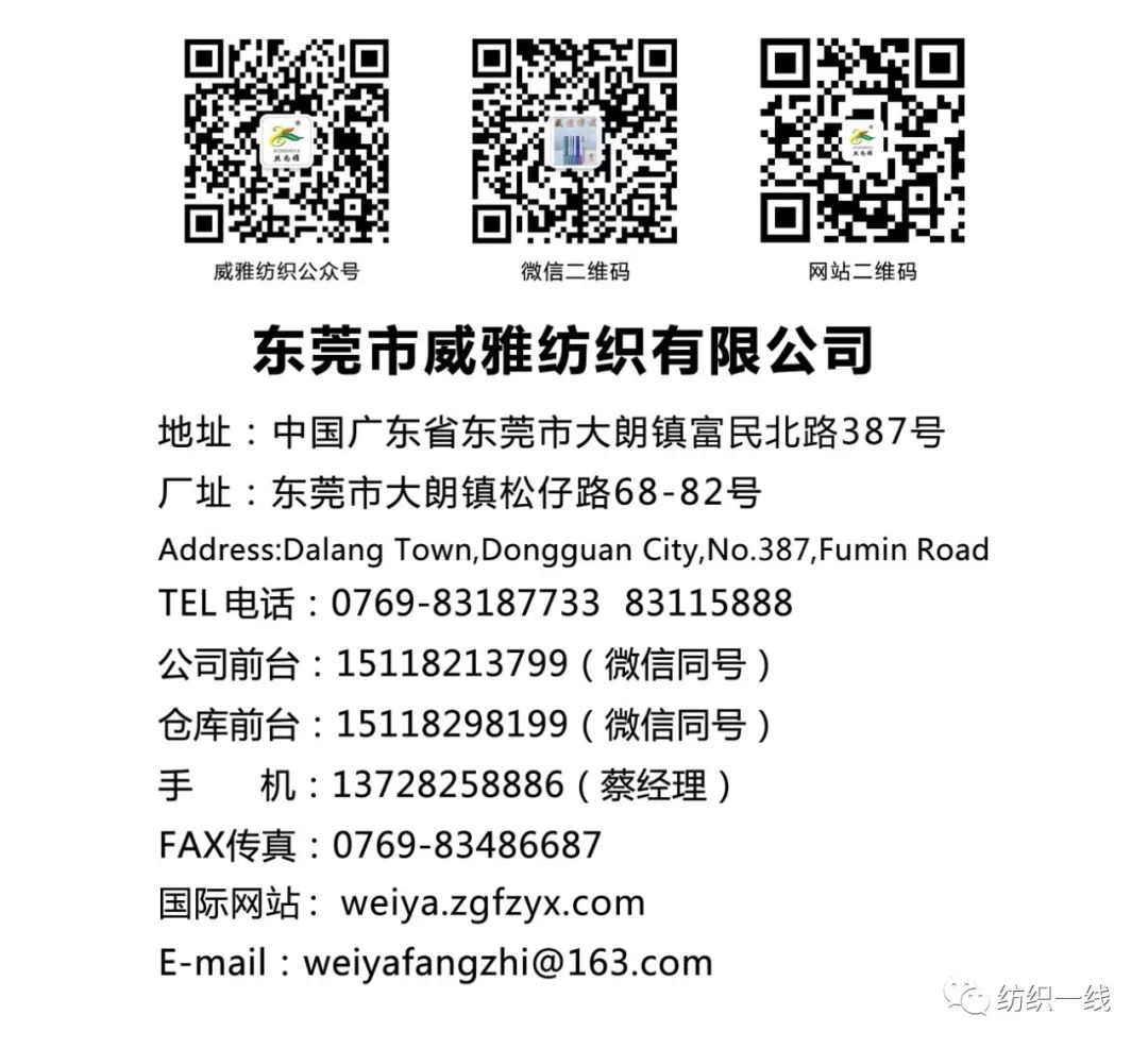 东莞市威雅纺织有限公司旗下工厂是东莞市裕雅纺织拼纱厂,座落于中国大朗国际毛织贸易中心,大朗被中国命名为美丽的羊毛衫镇。公司成立于1998年,专业从事于锦纶高弹丝,有色丝光棉,棉纱,纯棉花灰,涤棉花灰,锦纶高弹丝,晴棉,抗起球冰爽纱,丝光真三七,羊绒混纺纱,有色麻丝,有色人造毛,有色钻石棉,双曲,兔绒包芯纱,仿亚麻;可以多股单股拼纱混纺订染订纺合股加捻。具备大型染纺一体化的生产车间,配备先进,依据毛织行业需求,专设有粗支数拼纱机、细支数拼纱机。目前设备配套近40台粗、细倍捻机,月生产量200吨以上,高弹丝月生产量300吨以上。
