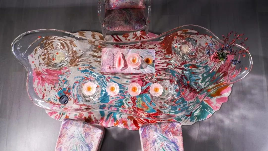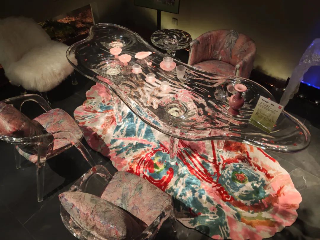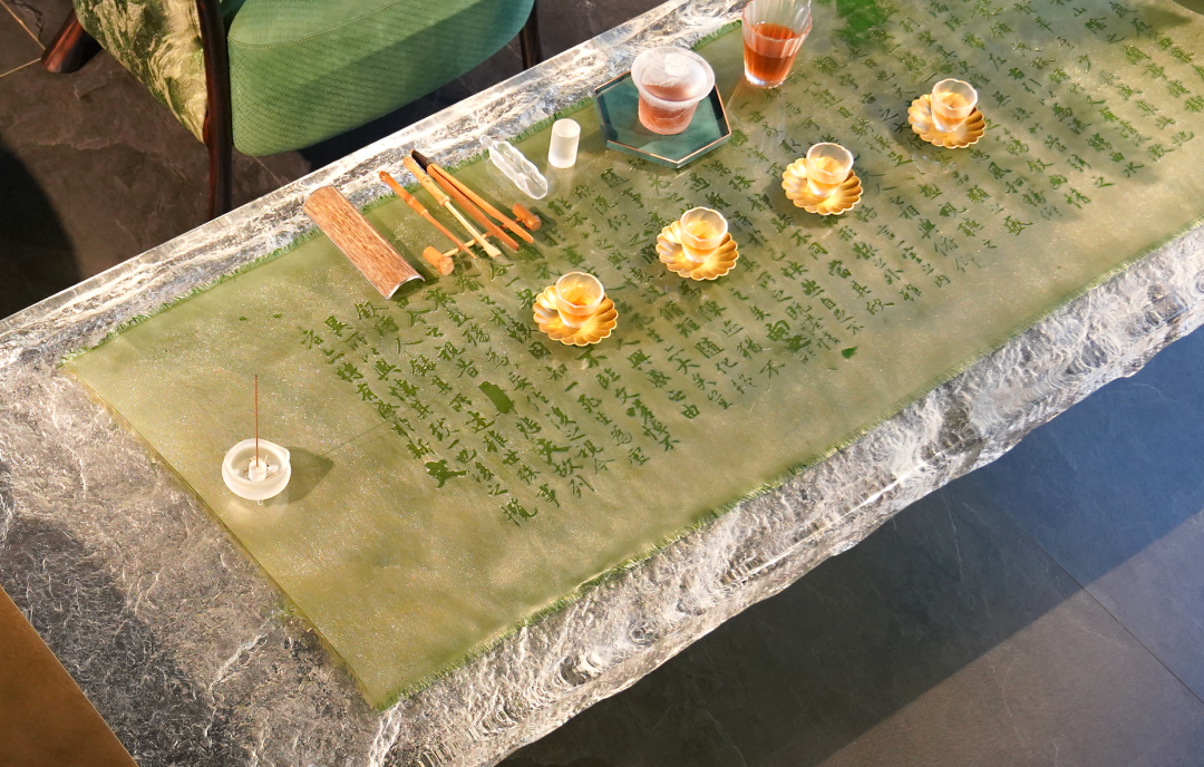国礼大师李加林将《兰亭序》织成古锦,采用将织锦嵌入冰岛水晶的工艺,塑造在河水中被千古冰封的样子,实现书法美、织锦美、意境美和谐统一,突破以往高端茶桌均采用名贵木材的概念,使当代中华文化创意设计实现新的跨跃。